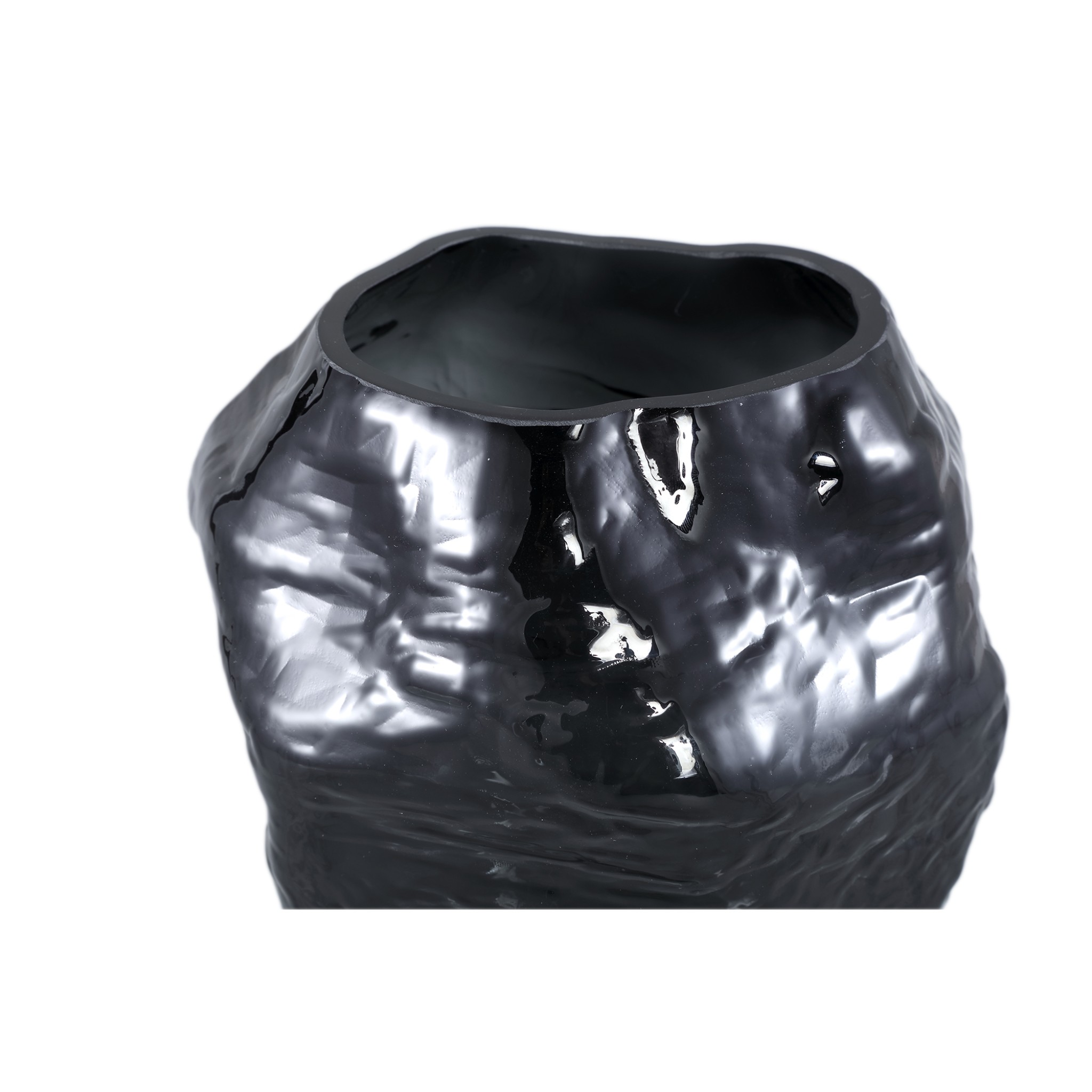 Zwarte glazen vaas met ronde, onregelmatige vorm. Formaat 18×30×18 cm, gewicht 1 kg. Luxe en modern design, ideaal als eyecatcher in elk interieur.