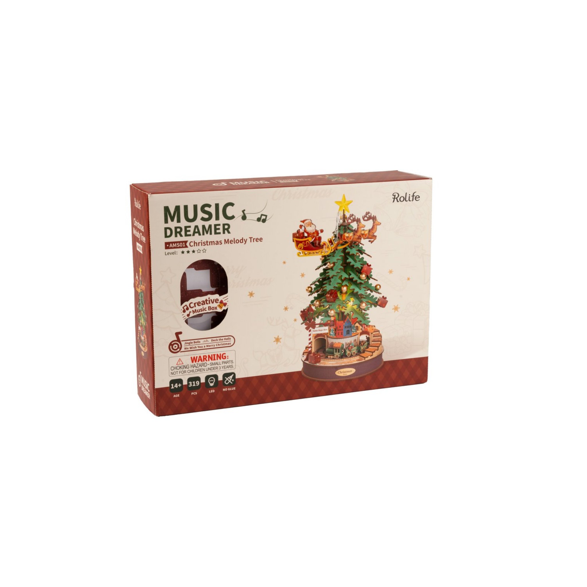 De Robotime Christmas Melody Tree (AMS01) is een prachtig DIY 3D houten bouwpakket dat een functionerende muziekdoos vormt met een kerstboomthema. Het pakket bevat 319 lasergesneden onderdelen van milieuvriendelijk berkenmultiplex, die eenvoudig in elkaar gezet kunnen worden. Voor sommige details wordt witte of vloeibare lijm aanbevolen.