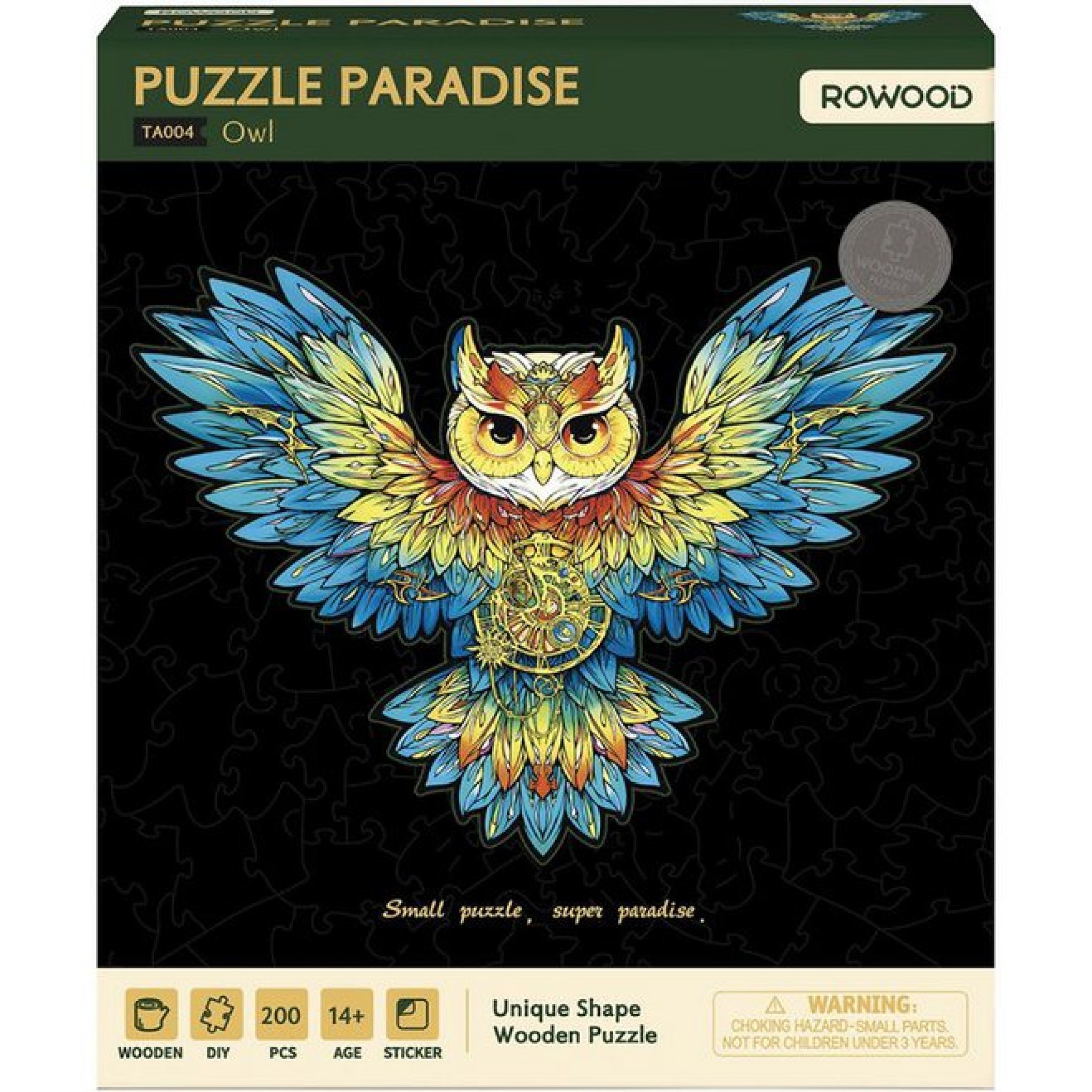 Ontdek de Rowood Paradise Owl houten legpuzzel, een kleurrijke en duurzame puzzel van 200 stukjes. Moeilijkheidsgraad ★★ voor puzzelaars vanaf 14 jaar.