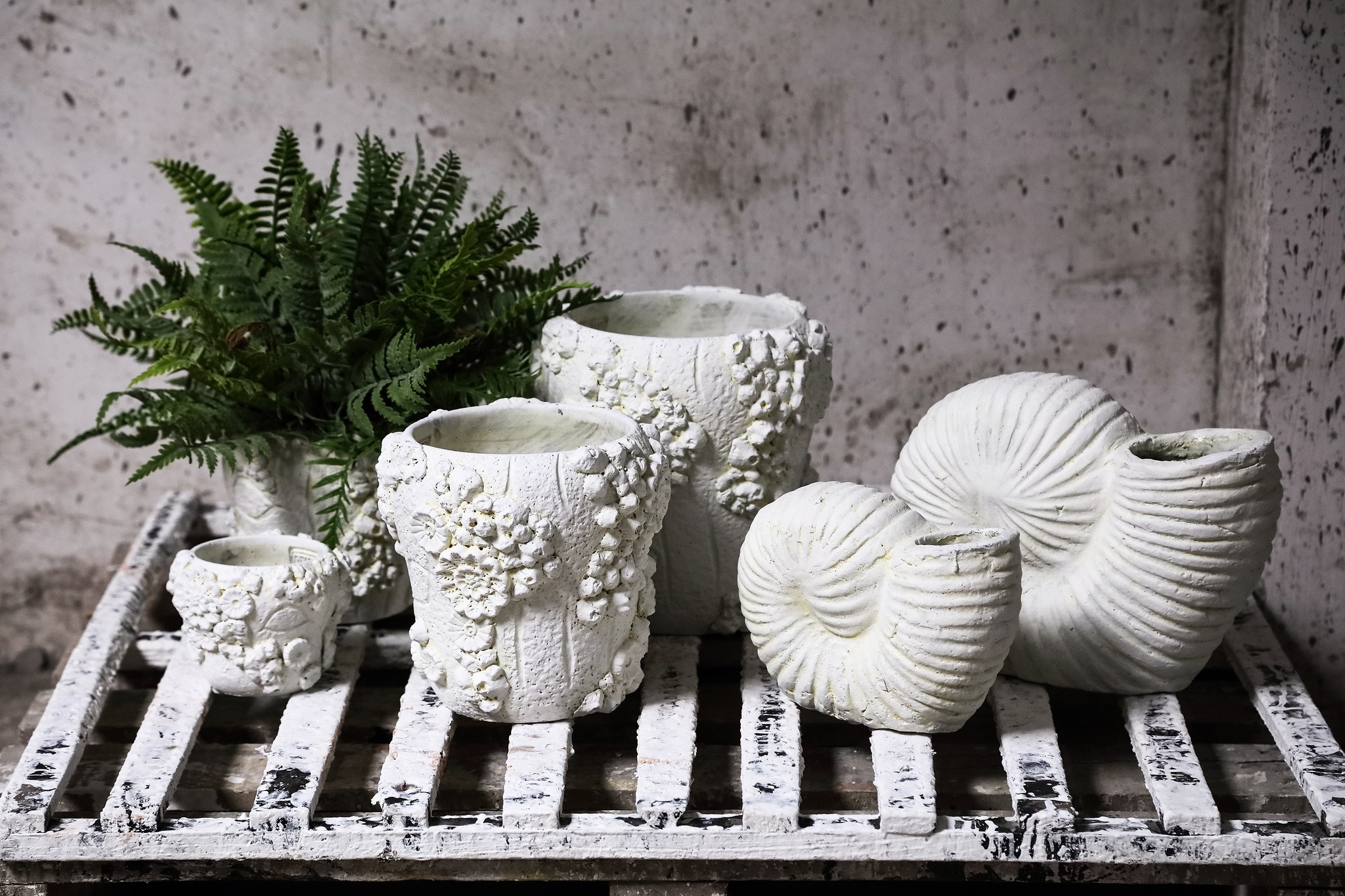 Witte cementen schelp als decoratiestuk in groot formaat. Inspiratie uit de gulden snede en Pi, 27 cm lang, geschikt voor binnen.