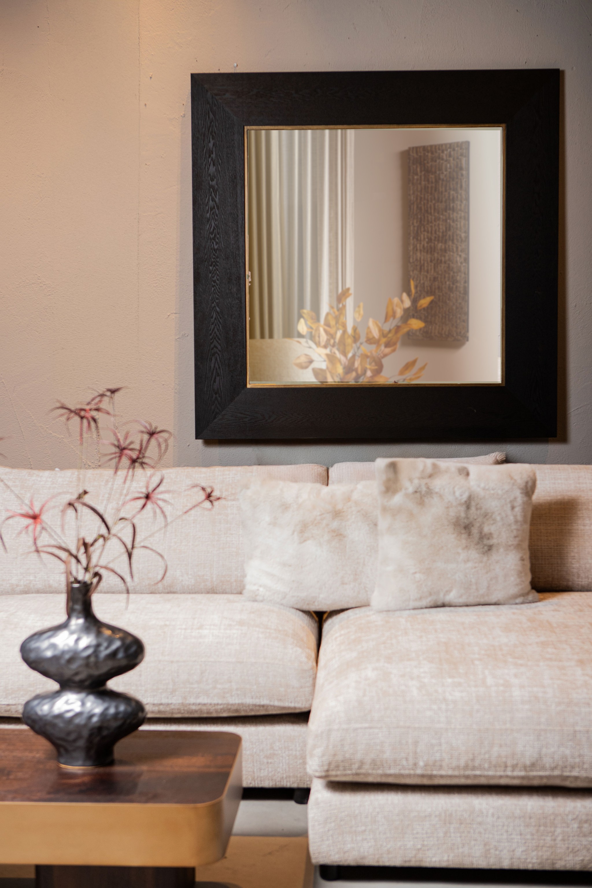 Vierkante wandspiegel met zwart houten fineer en gouden rand. De Tiess Black Square Mirror voegt luxe, karakter en elegantie toe aan elk interieur.
