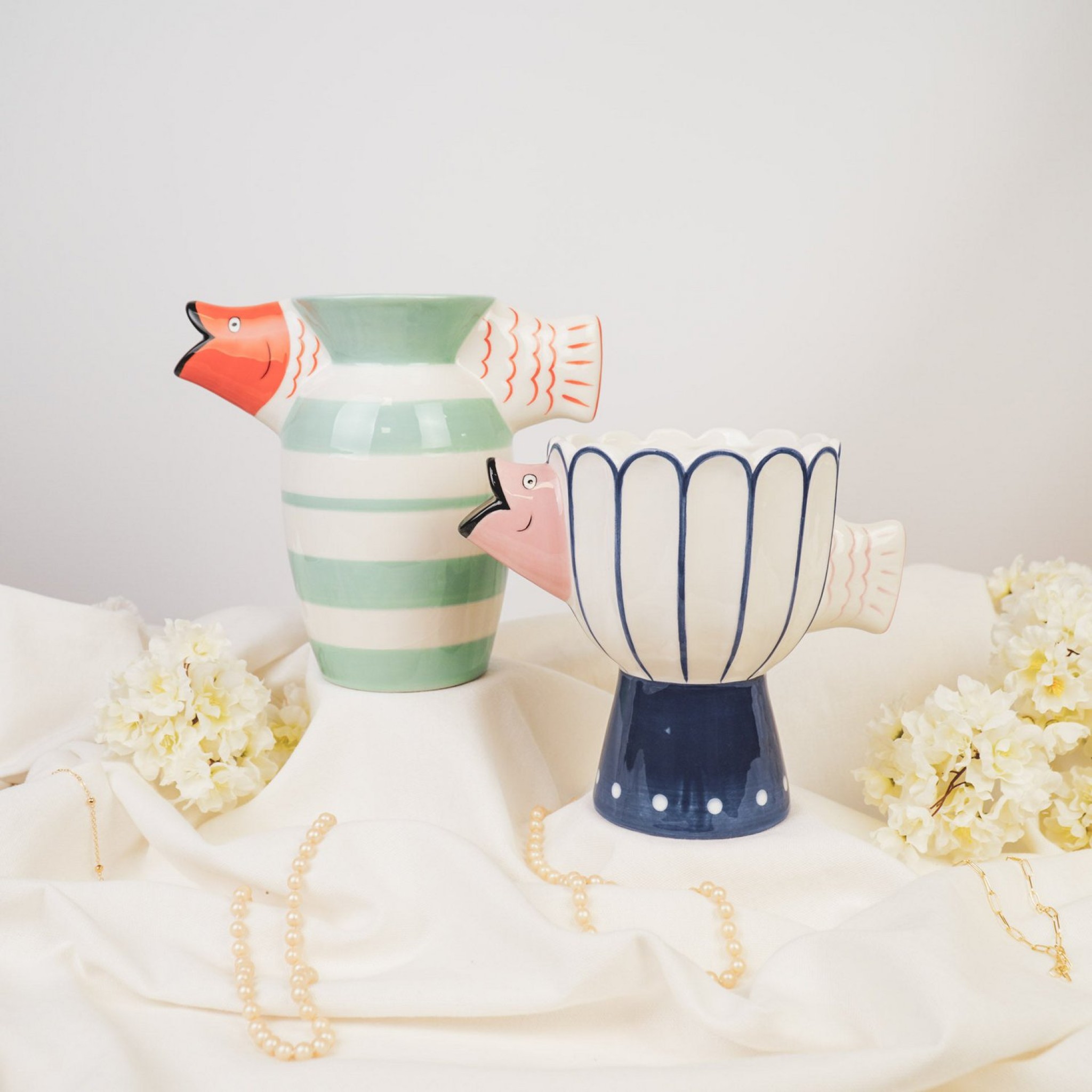 Net als een vis in de zee! Deze kleurrijke visvaas van dolomiet is een echt kunstwerk dat meteen de aandacht trekt. Perfect als speels accent in je interieur, ook zonder bloemen.